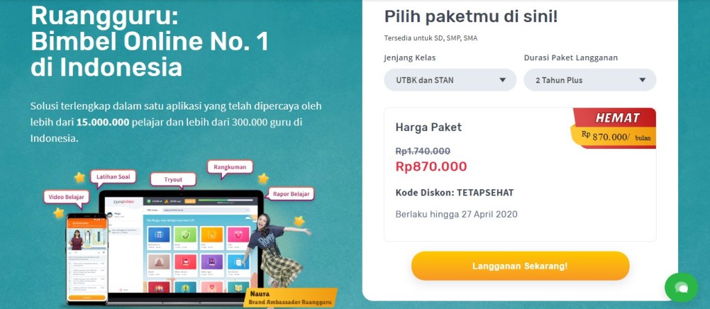 Akhirnya aku cerita ke orangtua, kalau aku mau berlangganan Ruangguru untuk membantu belajar selama di rumah. Awalnya orangtuaku menanyakan terkait harga paket dan aku mau ambil paket belajar apa. Terus aku bilang aku mau berlangganan paket UTBK dan STAN, nah harga paket yang Ruangguru sediakan itu ada empat untuk paket UTBK dan STAN, yaitu paket 1 bulan, 3 bulan, 1 tahun plus, dan 2 tahun plus.