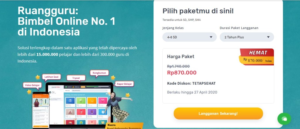 Akhirnya, orangtuaku membelikan adikku paket belajar kelas 4-6 dengan durasi 3 bulan aja, karena untuk menghadapi Ujian Nasional, nanti kalau suda sudah masuk SMP, aku suruh dia berlangganan Ruangguru lagi hehehehe. Ketika aku cek harga, ternyata untuk jenjang sekolah dasar juga mendapat diskon dengan menggunakan kode diskon TETAP SEHAT dan harganya menjadi Rp.335.000 dari harga aslinya Rp.675.000. Waaah senangnya, orangtua hanya mengeluarkan Rp.895.000 untuk 2 paket belajar dengan durasi 1 tahun plus dan 3 bulan. Aku dan adikku semakin rajin belajar dengan menggunakan Ruangguru.